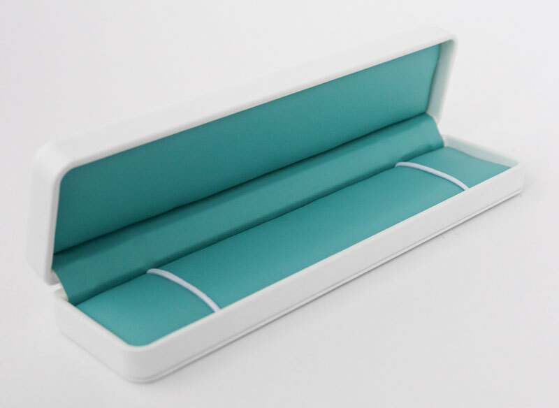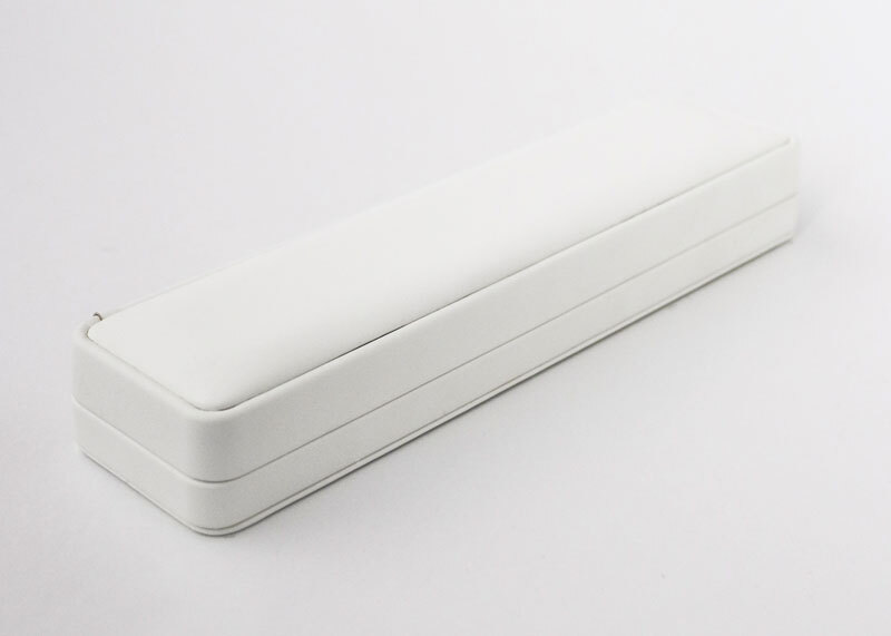 Корпус размером 218×54×30 мм рассчитан на продолговатые украшения: браслеты, цепочки или компактные часы, обеспечивая им устойчивое положение и аккуратную линию выкладки в витрине или при вручении. Внешняя обтяжка из искусственной кожи светлого оттенка подчёркивает премиальный характер упаковки, а внутренняя отделка из искусственной кожи контрастного тона создаёт яркий фон для металла и камней.