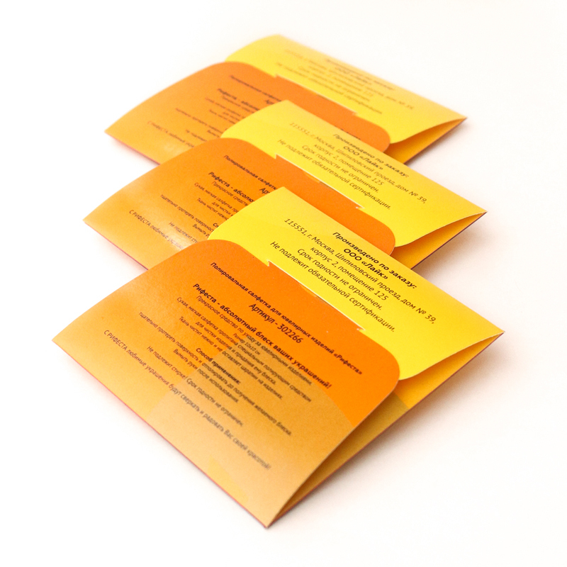 Салфетки просты и удобны в применении, подходят для регулярного ухода за украшениями и часто используются как полезный подарок при продаже ювелирных изделий, подчёркивая заботу о клиенте и его украшениях. Компактный размер делает их удобными для вложения в упаковку или выдачи вместе с чеком, а оптовая фасовка помогает оптимизировать закупки.